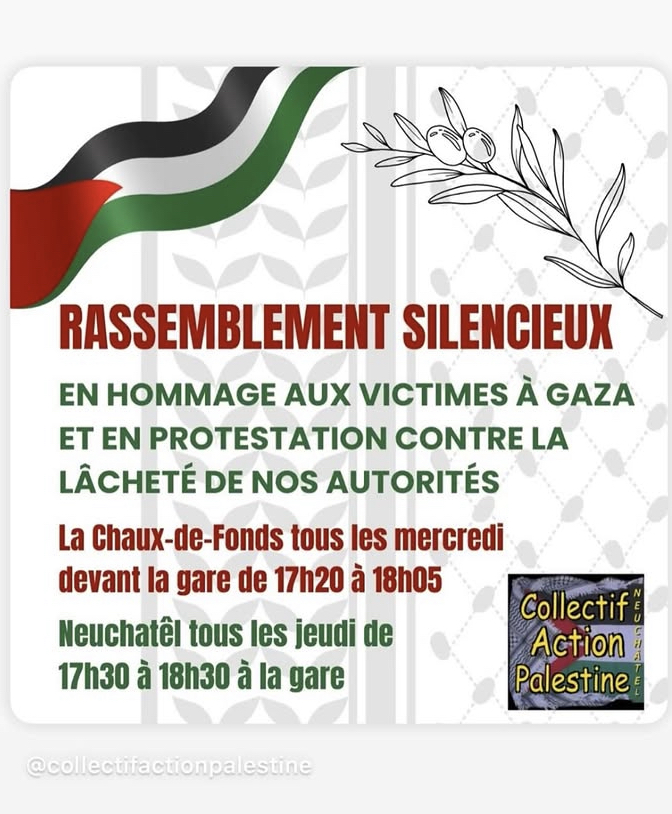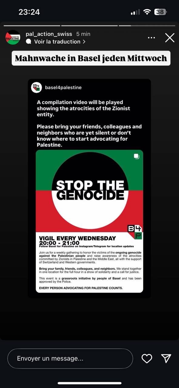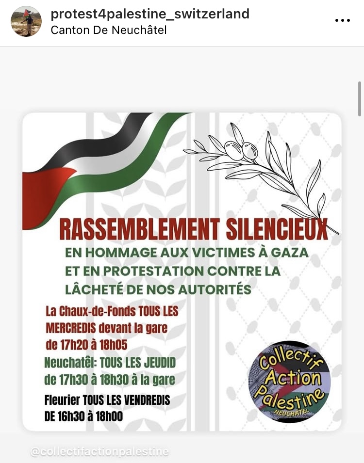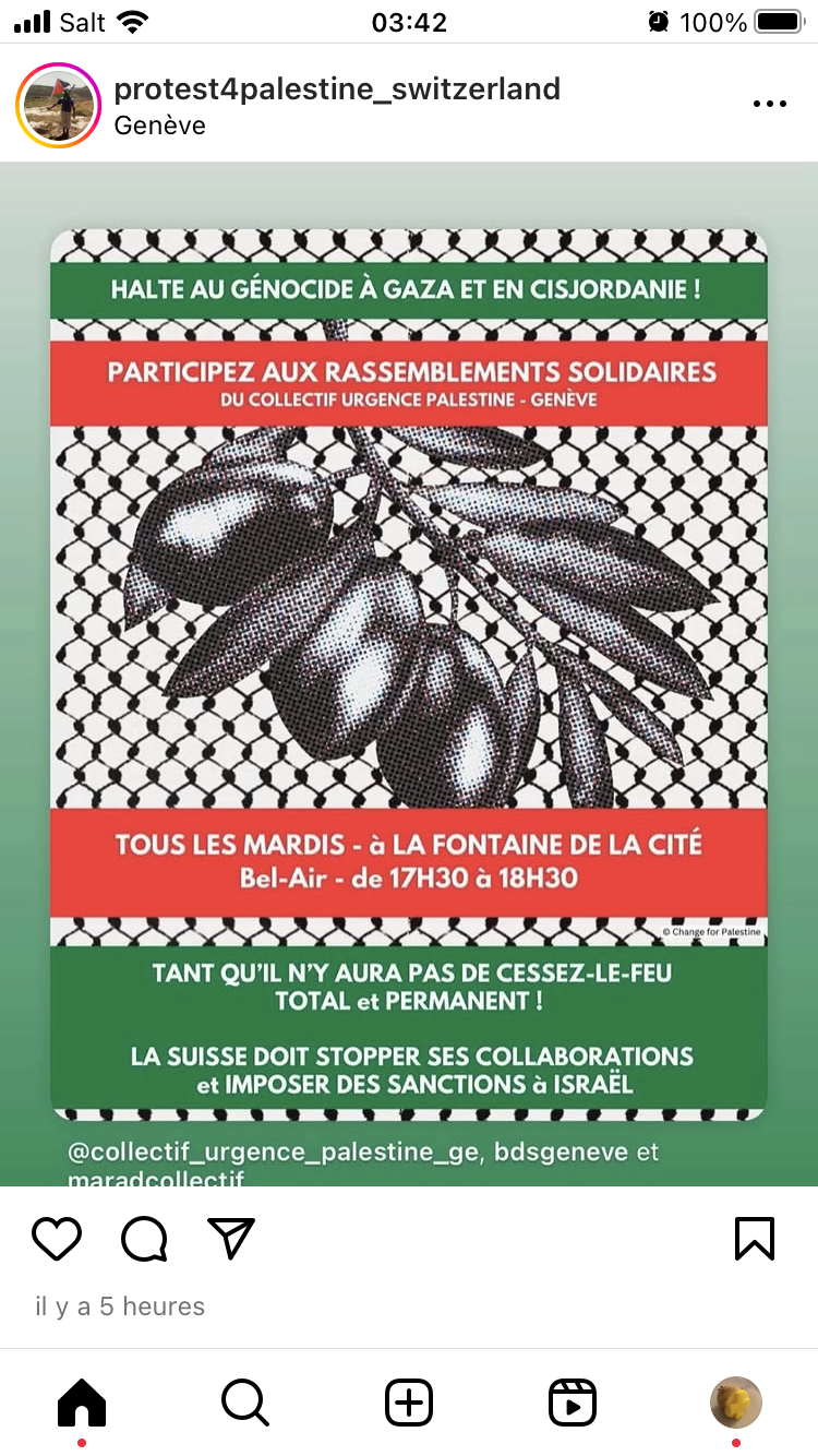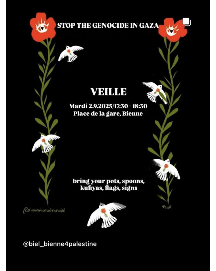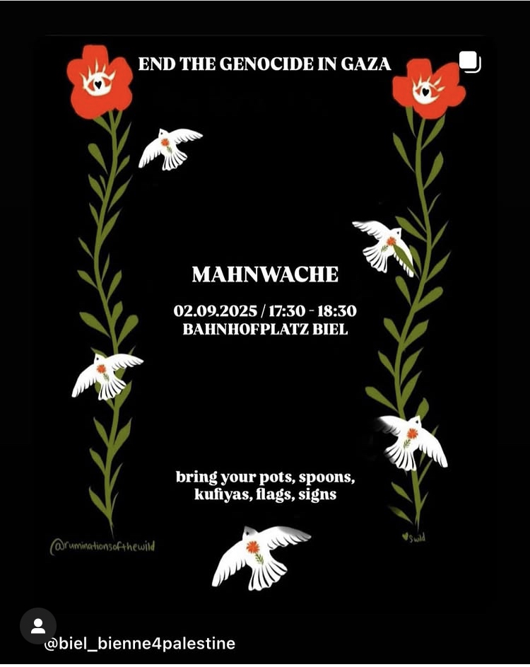 - weekly: basel, mahnwache am mittwoch, 20:00 - 21:00, folge Basel for Palestine auf Telegram oder IG für Infos zum Ort