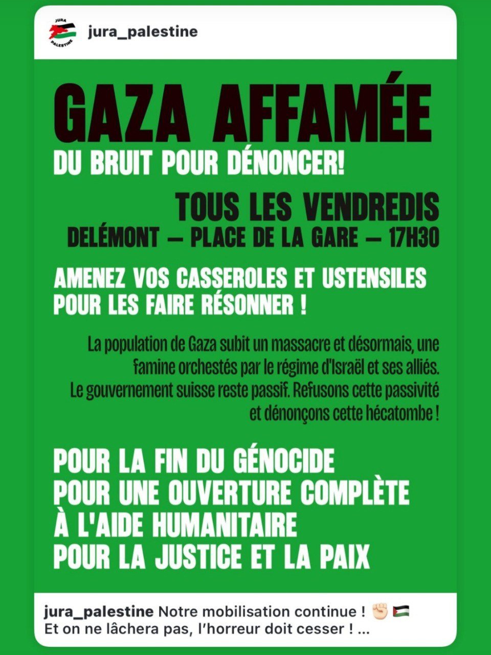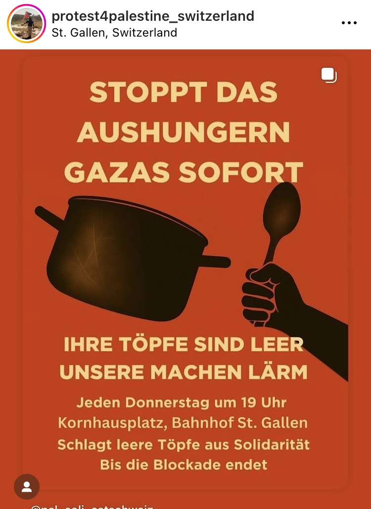 - weekly: bahnhof st.gallen kornhausplatz, macht lärm für gaza, jeden donnerstag um 19h