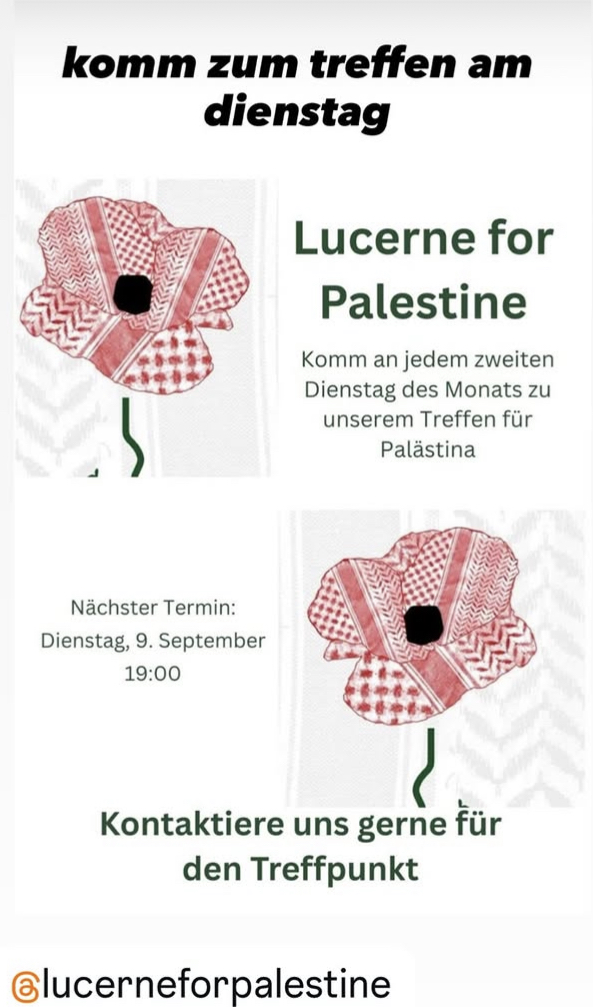- every third week: luzern, 19:00, kontaktiere lucerneforpalestine (IG) für den treffpunkz, ab di 30. september